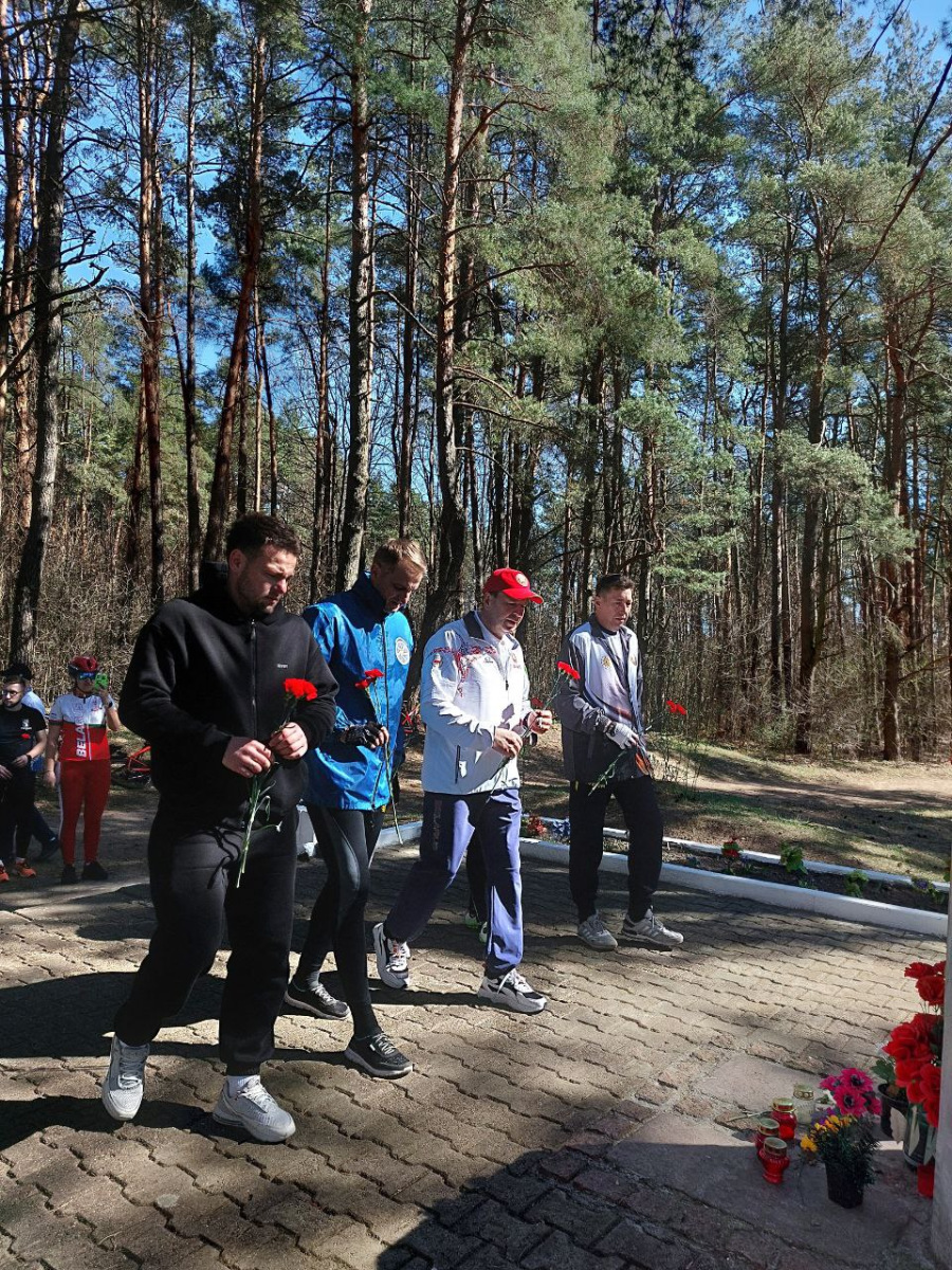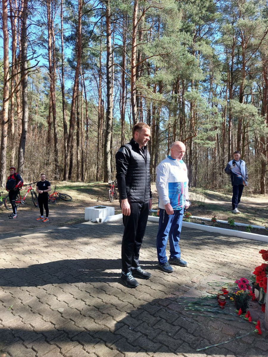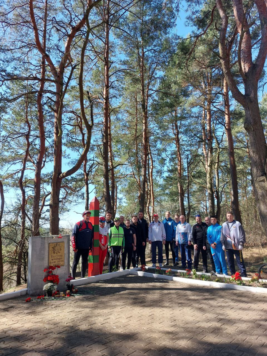 Участники веломарафона возложили цветы к памятнику курсантам-пограничникам, погибшим 22 июня 1941 г., посмотрели, как идёт реконструкция мемориального комплекса Шталаг 234